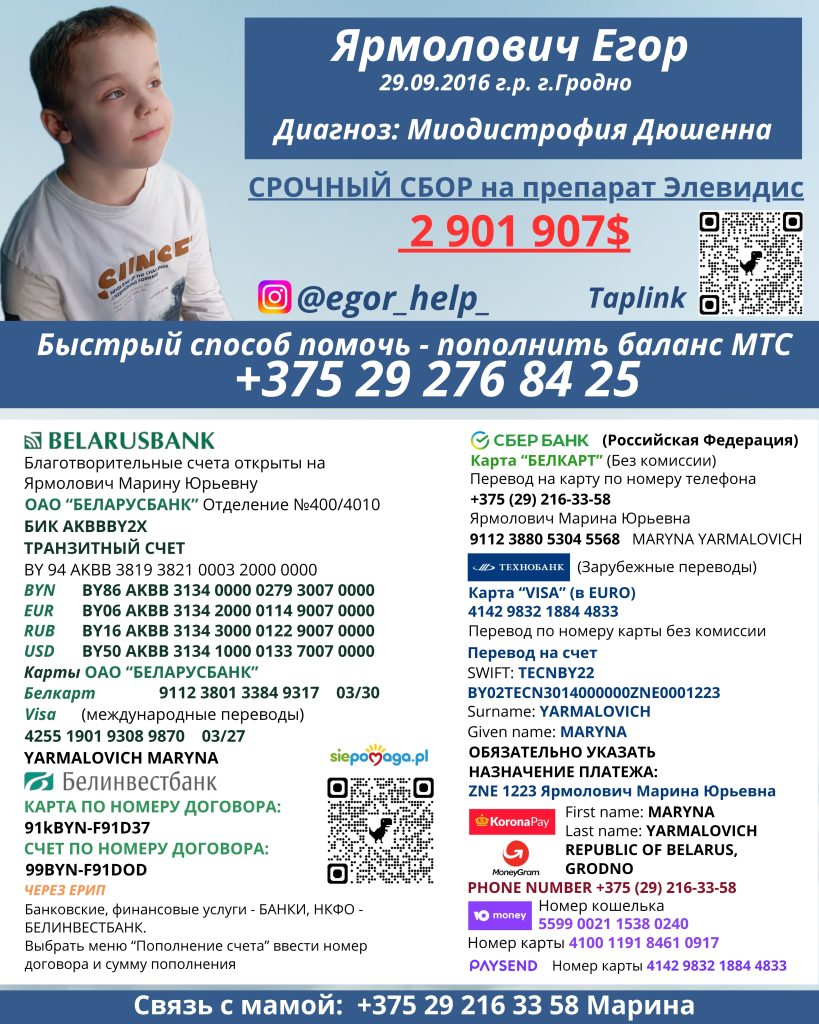 За помощью обращается Ярмолович Марина, мама мальчика Егора, с надеждой на любую помощь в сборе средств на лечение сына. У него диагностировано тяжелое генетическое заболевание – миодистрофия Дюшенна, приводящая к атрофии мышц.